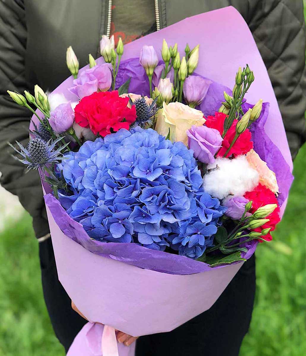 Гвоздики придают букету изысканность и изящество, гортензии добавляют ему объема и яркости, розы символизируют любовь и страсть, эрингиум вносит нотку оригинальности и экзотики, а эустома придает композиции нежность и элегантность. Вместе они создают уникальное и запоминающееся сочетание цветов, которое является искренним выражением твоих чувств и мыслей о любимом человеке.
