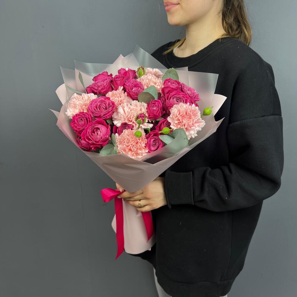 Семь роскошных диантусов, символизирующих восхищение и уважение, гармонично переплетаются с четырьмя нежными пионовидными кустовыми розами, которые олицетворяют романтику и изящество.