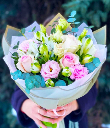 Этот букет подойдет для любого торжества или праздника, а также станет идеальным подарком для близких и дорогих людей. Он наполнен светом и теплом, которые перенесут Вас в мир красоты и гармонии.Представляем Вашему вниманию нежный и элегантный букет, который подарит массу положительных эмоций и оставит яркие воспоминания. Букет состоит из прекрасной розовой эустомы, которая символизирует нежность и душевную гармонию, роз, которые олицетворяют любовь и страсть, и белых альстромерий, которые символизируют чистоту и душевную красоту. Композиция дополнена зеленью, которая придает ей естественность и свежесть.